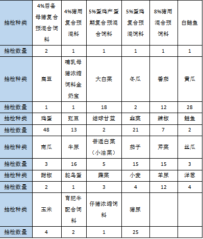 聊城市农业农村局开发区和高新区分局于2024年5月29日至2024年11月20日开展2024年度农产品质量安全监测工作,抽检种类35种,其中蔬菜154批次,畜禽产品112批次,其中饲料10批次、禽蛋49批次、尿样53批次(猪尿25批次、牛尿16批次、羊尿12批次),水产品6批次,粮食8批次(玉米4批次、小麦4批次)。详见表 1。